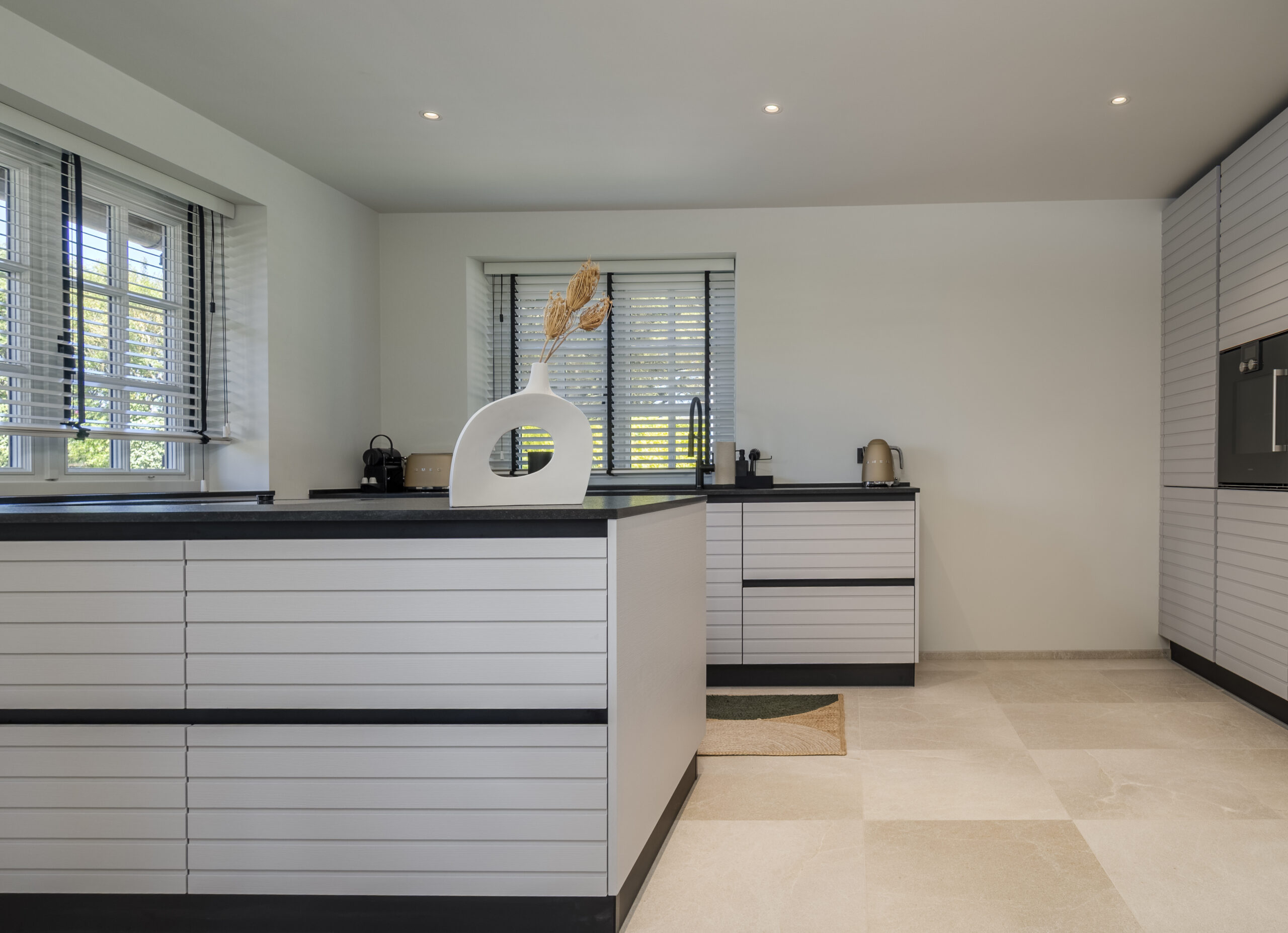 Das Herzstück jeder Haushälfte ist der offen gestaltete Wohn- und Essbereich mit integrierter Küche. Hier trifft stilvolle Klarheit auf wohltuende Gemütlichkeit. Der Kamin sorgt an kühleren Tagen für eine warme Atmosphäre, perfekt für entspannte Abende nach einem langen Strandspaziergang.